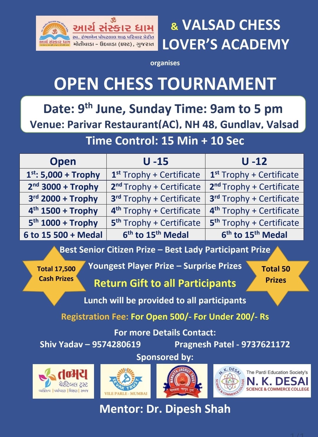 ફૂલ ૫ રાઉન્ડમાં સમગ્ર ટુર્નામેન્ટ યોજાશે જેમાં વિજેતાઓને રોકડ પુરસ્કાર, ટ્રોફી અને સર્ટિફિકેટ આપવામાં આવશે.