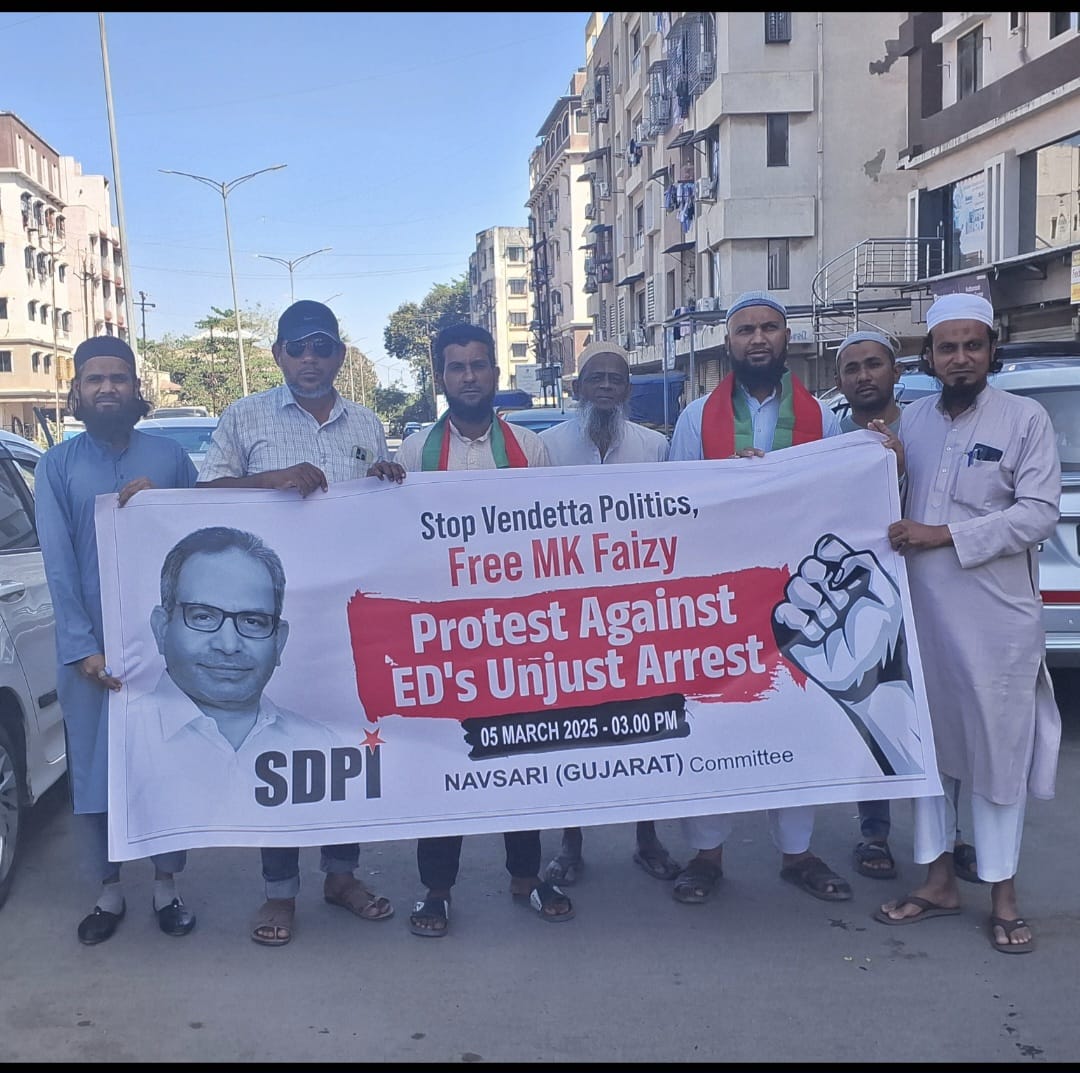 જેથી ED ની કાર્યવાહી ને લઈ પૂરા ભારત મા SDPI પાર્ટી ના કાર્યકર્તાઓ રસ્તા ઉપર ઉતરી વિરોધ પ્રદર્શન કર્યું હતું અને આજે નવસારી SDPI પાર્ટી દ્વારા વિરોધ કરવામાં આવ્યું અને SDPI ના કાર્યકરોનું કહેવું છે કે સમગ્ર ભારત દેશમા અલગ અલગ જગ્યાએ વક્ફ બિલ બાબતે SDPI પાર્ટીએ મોટી સંખ્યામાં રસ્તા ઉપર ઉતરી વિરોધ કર્યો હતો,જેનાથી ભાજપ ડરીને જાંચ એજંશી ED નો સહારો લઈ રાષ્ટ્રીય અધ્યક્ષ એમ.કે. ફેઝી સાહેબ ની ધરપકડ કરી SDPI પાર્ટી ને ડરાવવાની કોશિશ કરી રહી છે. ED ની કાર્યવાહી ની SDPI નિંદા કરી હતી. અને રાષ્ટ્રીય અધ્યક્ષ એમ.કે. ફેઝી ને જલ્દ થી જલ્દ છોડવામાં આવે તેવી માંગ કરી હતી વધુ મા SDPI ના કાર્યકરોએ જણાવ્યું હતું SDPI ખોફ થી મુક્તિ અપાવવાના નારા સાથે કામ કરે છે.SDPI ના કાર્યકરો ડરી જશે એ ભાજપ નો વહેમ છે,