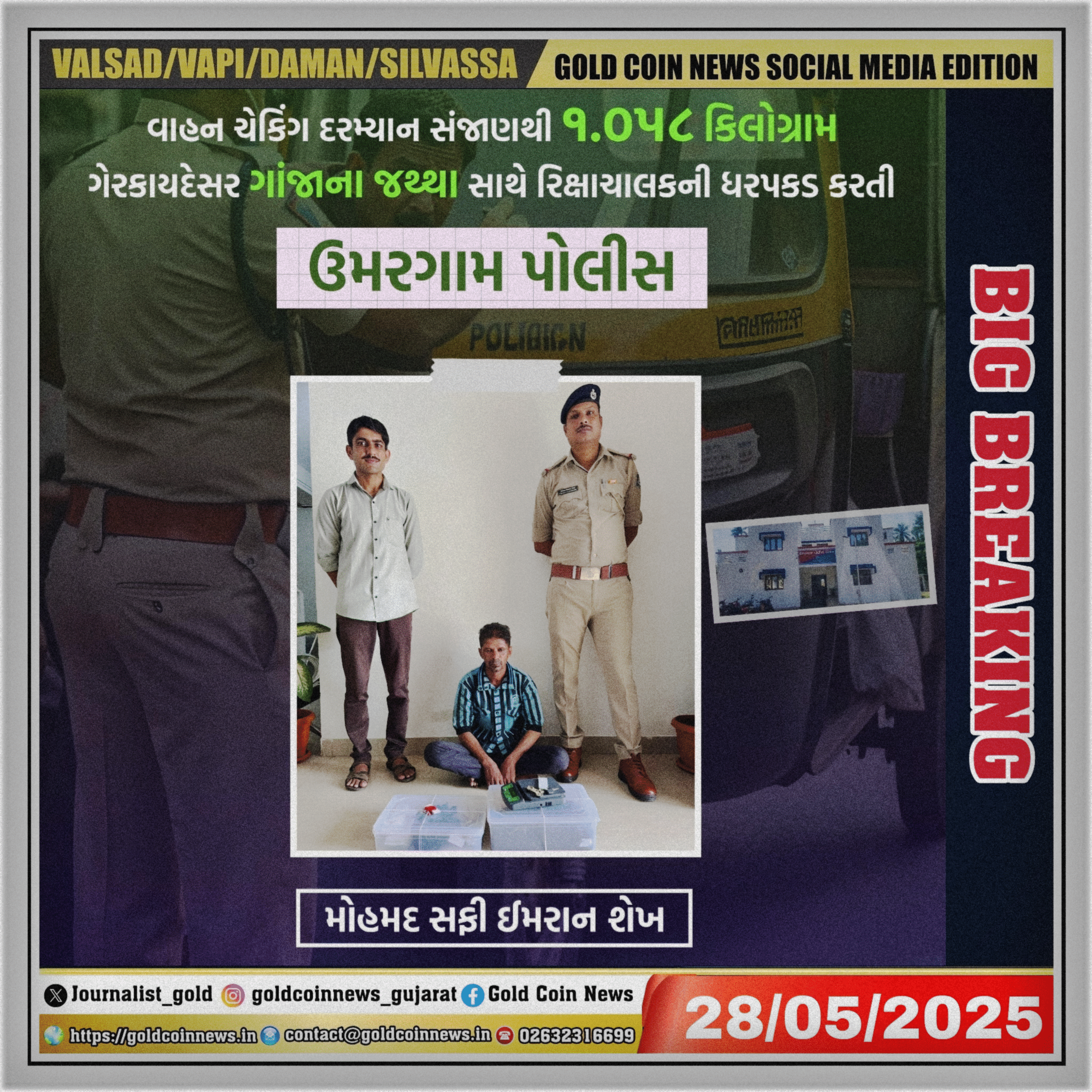 આ રીક્ષા મોહમ્મદ શફી ઇમરાન શેખ (ઉમર 58 )રહે સંજાન બંદર અરમાની અપાર્ટમેન્ટ તા. ઉંમરગામ જિ. વલસાડ નામના વૈકિતની માલિકીમાહતી. પોલીસે આરોપી સામે NDPS Act, 1985ની કલમ 8 (સી) 20 (બી)(¡¡)(B), અને 29 મુજબ ગુનો નોંધી કાયદેસરની કાર્યવાહી હાથ ધરી છે. કબજે કરાયેલ મુદ્દામાલ: 1.580 કિ. ગા. ગાંજો (કિંમત રૂ. 10,580/-) એક નાનો ઈલેક્ટ્રીક કાંટો (રૂ. 100/-) બજાજ ઓટો રીક્ષા નં.GJ15 AW.5708 (રૂ.80,000/-).