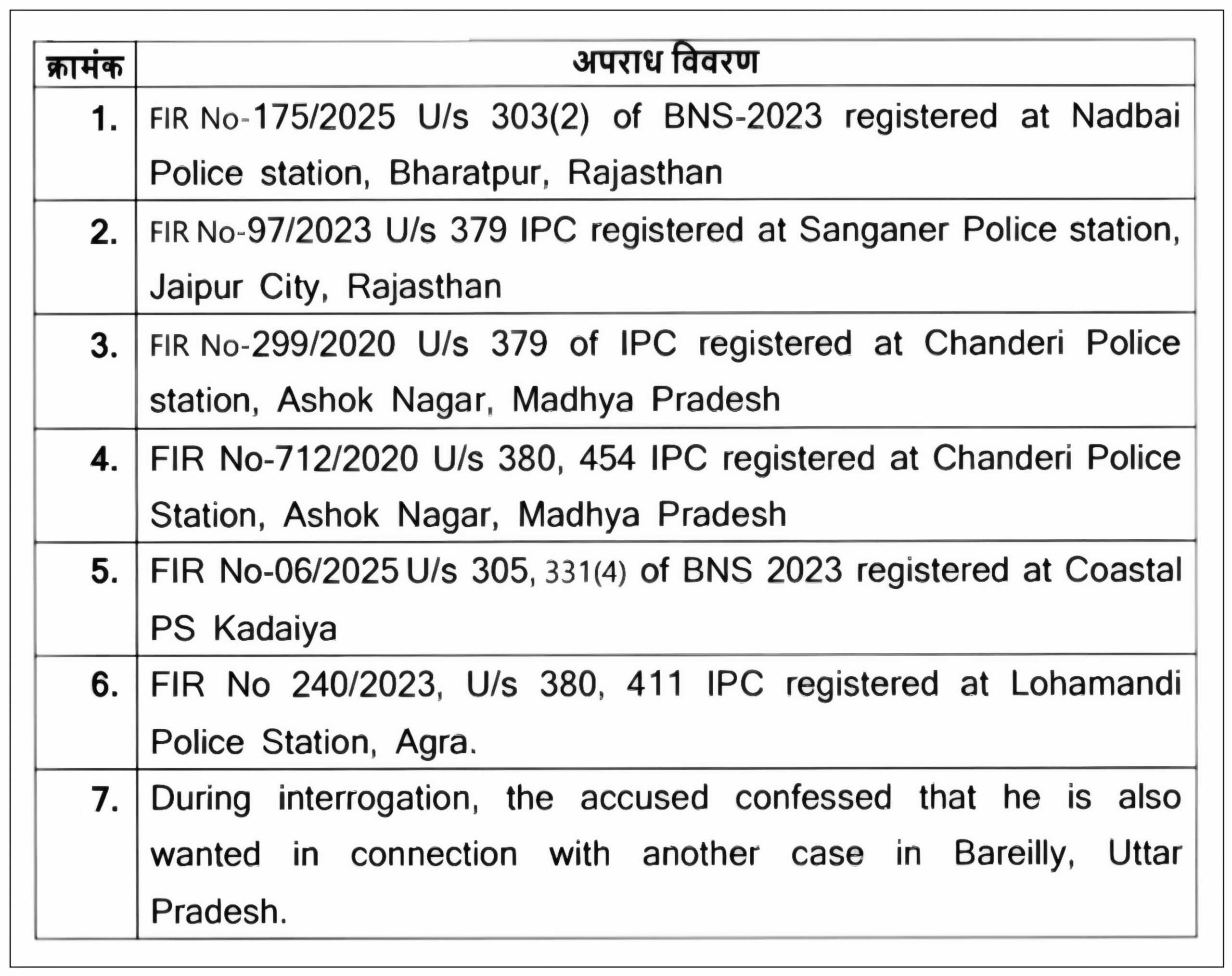 (अभियुक्त पर पहले से ही देश के अलग अलग राज्यों में चोरी आदि के 15 से अधिक मुकदमे चल रहे है)