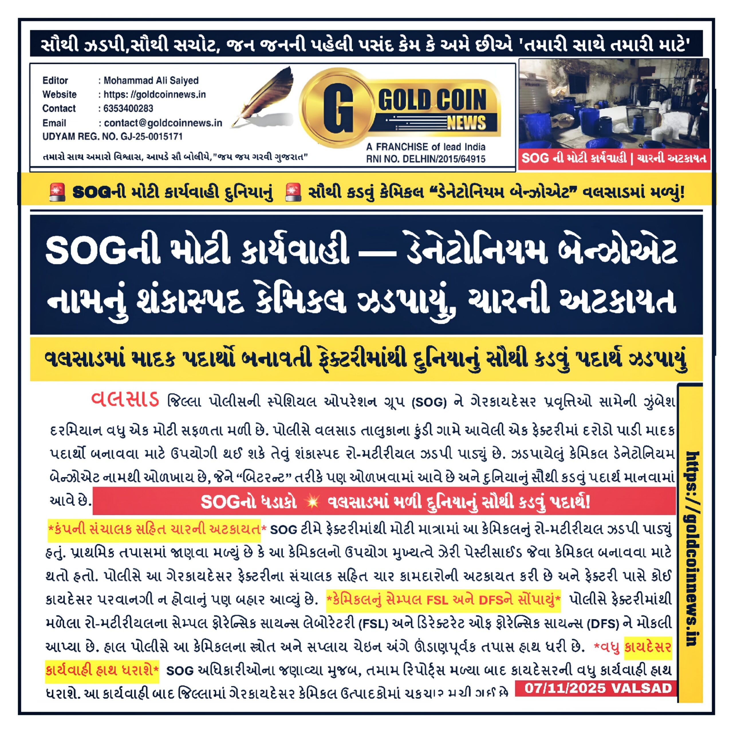 વલસાડ જિલ્લા પોલીસે ગેરકાયદેસર પ્રવૃત્તિઓ સામે હાથ ધરેલી ઝુંબેશ દરમિયાન વધુ એક મોટી સફળતા મેળવી છે. સ્પેશિયલ ઓપરેશન ગ્રૂપ (SOG) એ વલસાડ તાલુકાના કુંડી ગામે આવેલી એક ફેક્ટરીમાં દરોડો પાડી, માદક પદાર્થો બનાવવામાં ઉપયોગી થઈ શકે તેવું શંકાસ્પદ કેમિકલ ઝડપી પાડ્યું છે. ઝડપાયેલું પદાર્થ ‘ડેનેટોનિયમ બેન્ઝોએટ’ (Denatonium Benzoate) તરીકે ઓળખાય છે — જેને સામાન્ય રીતે ‘બિટરન્ટ’ (Bitterant) તરીકે ઓળખવામાં આવે છે અને તેને દુનિયાનું સૌથી કડવું પદાર્થ માનવામાં આવે છે.