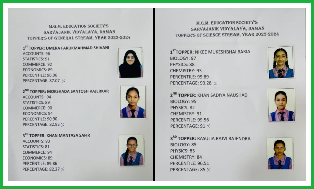 ધોરણ 12 વિજ્ઞાન પ્રવાહ અને સામાન્ય પ્રવાહના જાહેર થયેલા પરિણામમાં દમણની સાર્વજનિક વિદ્યાલયે મેળવેલી અભૂતપૂર્વ સિદ્ધિ* ગુજરાત માધ્યમિક અને ઉચ્ચતર માધ્યમિક શિક્ષણ બોર્ડ ગાંધીનગર દ્વારા