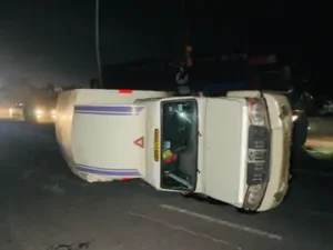 બ્રિજ પર ટેમ્પો ધડાકાભેર પલટી ગયો:પારડી હાઇવેના બ્રિજ પર પીકઅપ ટેમ્પો માર્યો પલટી