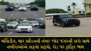 રોલો પાડવા નેશનલ હાઈવે બાનમાં લીધો, વીડિયો વાઈરલ મર્સિડીઝ, થાર સહિતની નંબર પ્લેટ વગરની કારો સાથે નબીરાઓએ કાફલો કાઢ્યો, રોડ પર ટ્રાફિક જામ